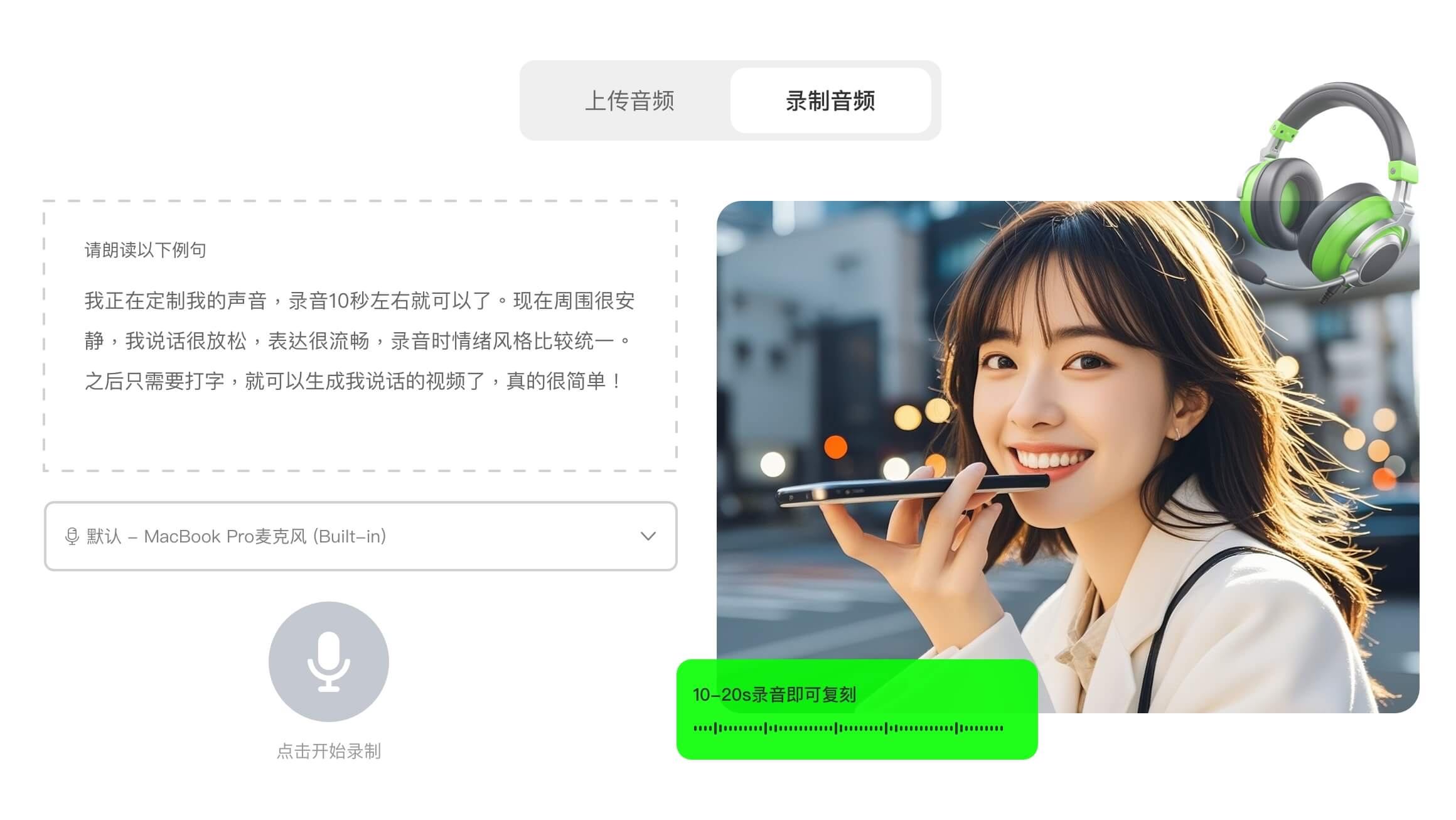 上传10~20s音频,高度还原真人音色特点、说话风格、 口音和声学环境